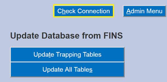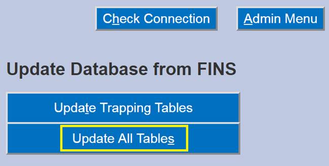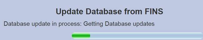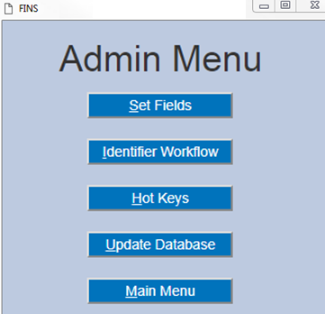 · Update Database: Allows connection to the FINS Database when Online to retrieve current Location, User Logins, Workflows and Pick List Menu data.