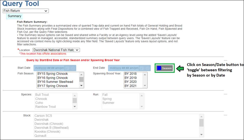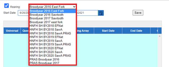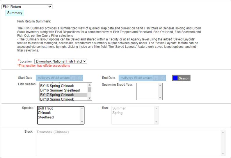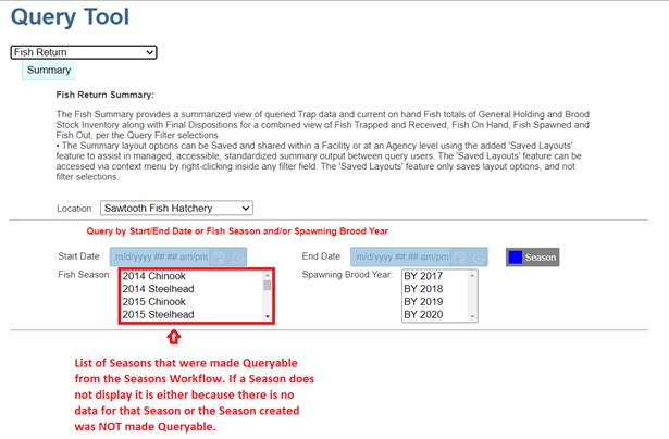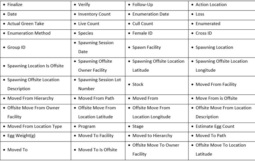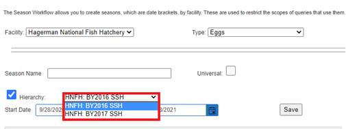 · Season – View Seasons and associated Season Columns (Universal; Season; Season Creator; Type; Facility; Incubation Hierarchy; Rearing Array; Start Date; End Date)