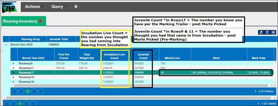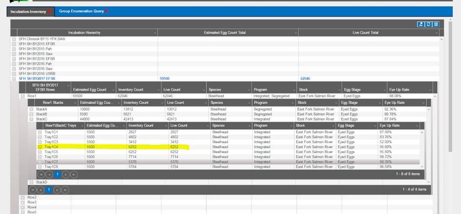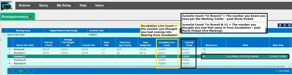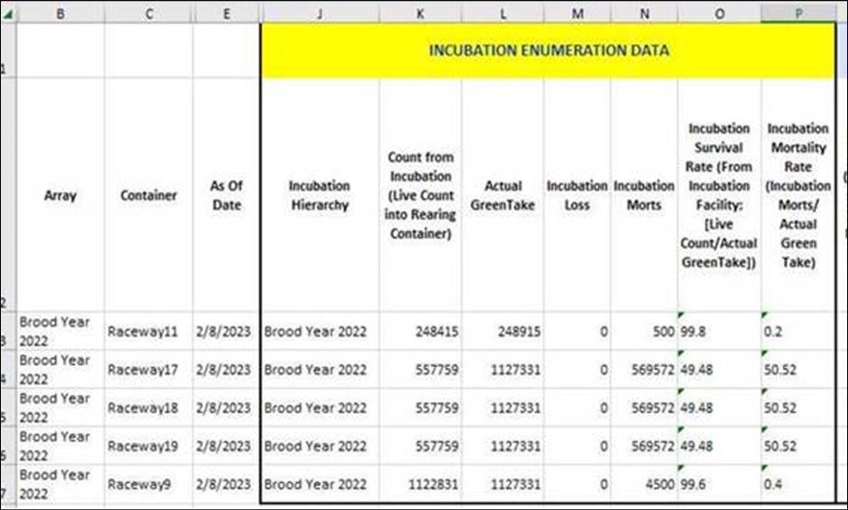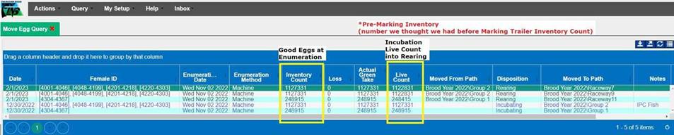 o Users can use this query to see the Good Number of Eggs at Incubation vs the Number of Eggs that were moved into a Rearing Container.Incubation Live Count that was moved into Rearing.