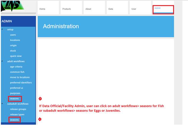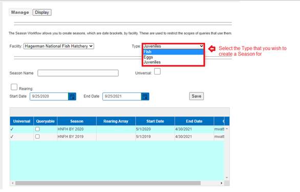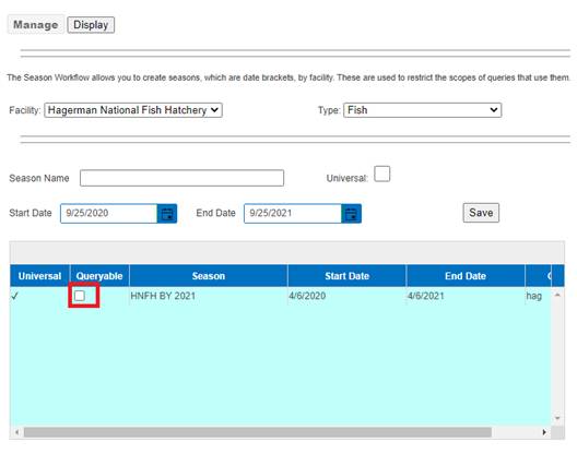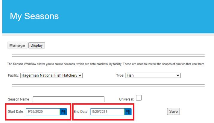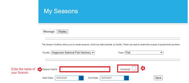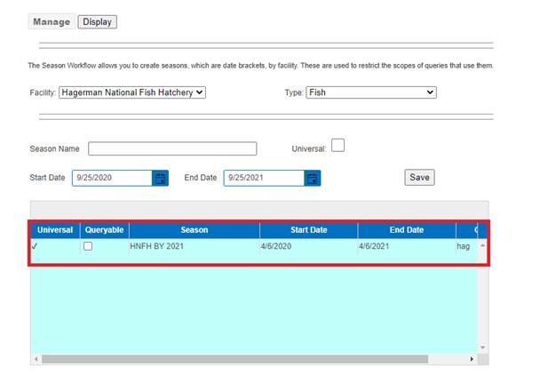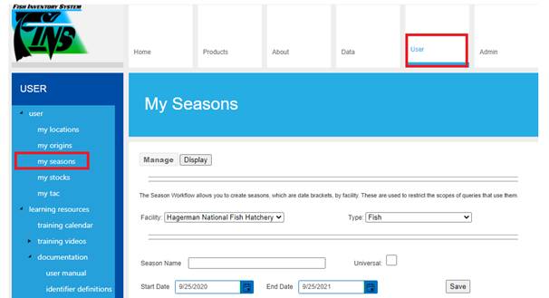 Seasons (FINSNet.org > Admin > Workflows > Seasons)