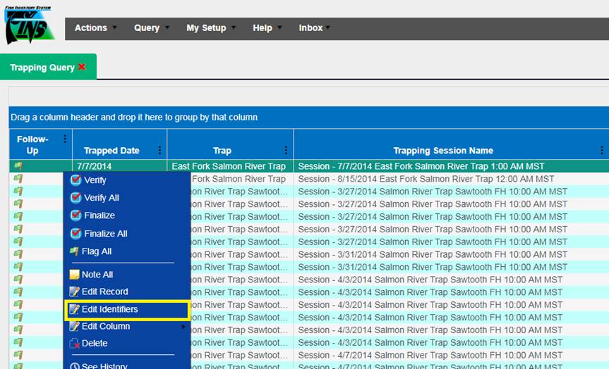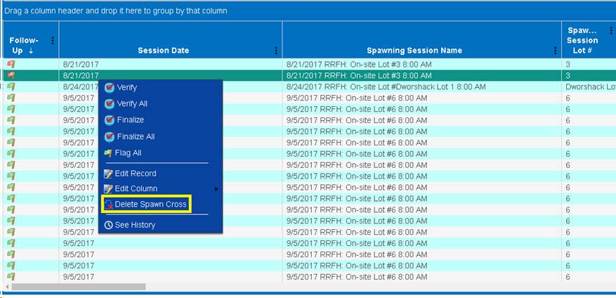 7. Select the record that is of interest and right click on it. In this case, the selected record is highlighted in blue below