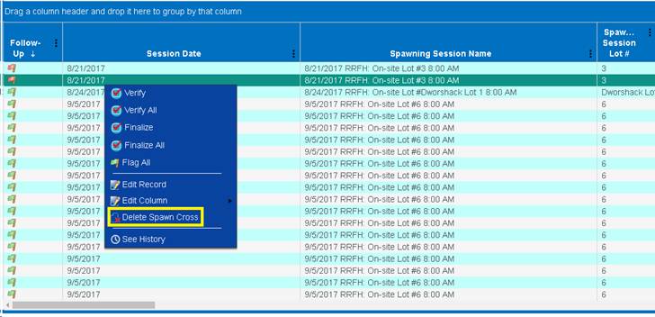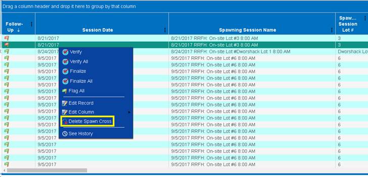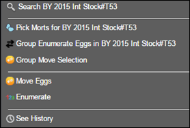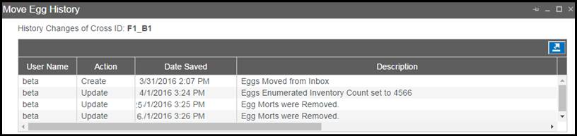 History is currently only available in Incubation records. A grid displaying a history of changes made to an Egg Group is available by Right clicking on the Eggs in the Count Summary Incubation, Move Egg Query and All Spawned Crosses Grids (on Moved eggs only).