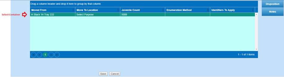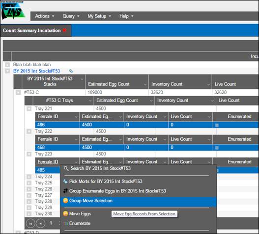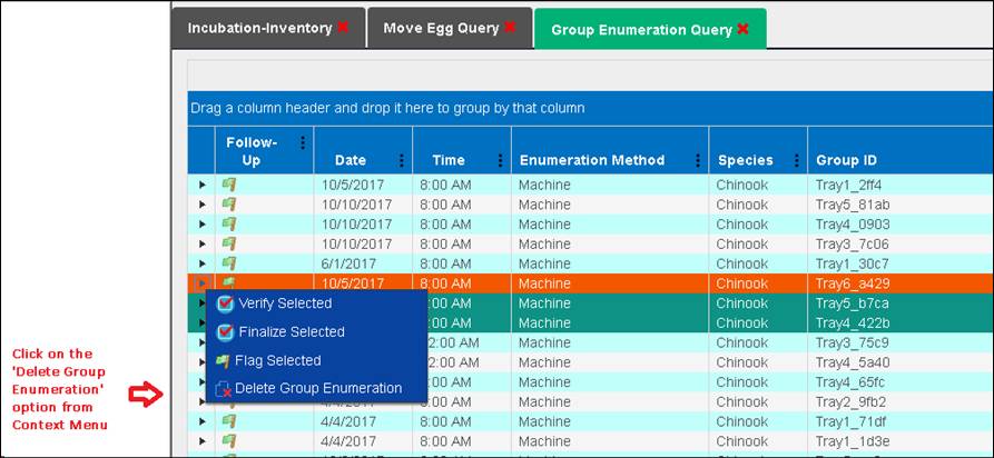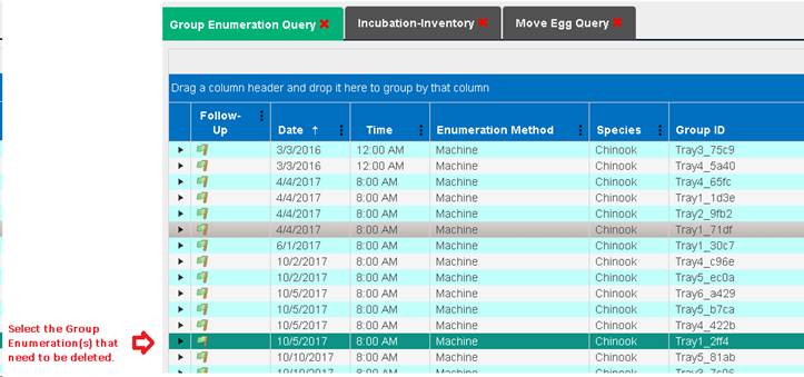 11. If a Group Enumeration has been moved to another Container, you have to first delete the Move from the ‘Move Egg Query’ in Incubation, and then go back to the ‘Group Enumeration Query’ to delete the Group Enumeration. To delete a Move, refer to the ‘Move Egg Query’ section under ‘Deleting a Move’.