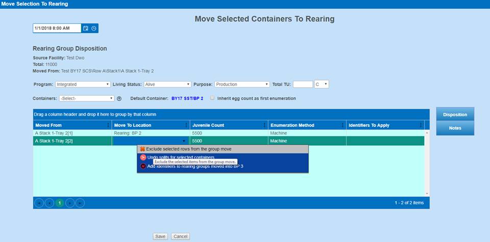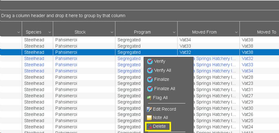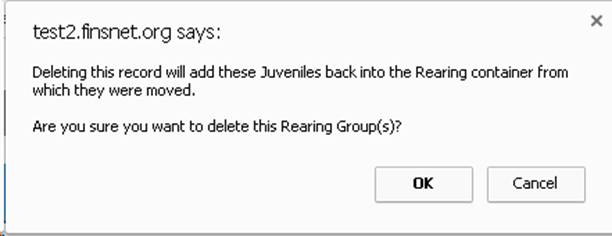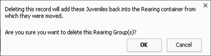 10) If intended, select ‘OK’ and the Deleted Move of Juveniles will be moved back into the Rearing Container from which they were moved out of (From Vat38 back into Vat32 in this example).