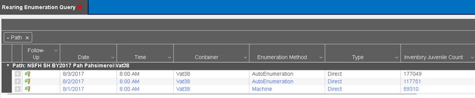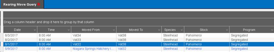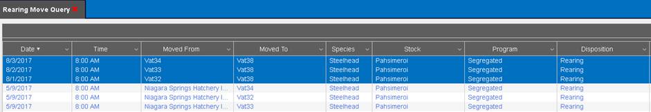3) The highlighted moves of containers (Vat32, Vat33, Vat34) below were moved into container ‘Vat38’. The ‘Rearing Move’ Query will display a total of 3 move transactions.